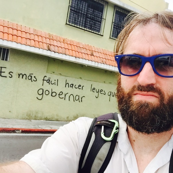 A bearded man in a white shirt and blue sunglasses takes a self portrait in front of some graffiti on a building.