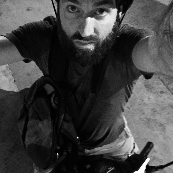 This is a black and white photo of a bearded man taking a selfie.