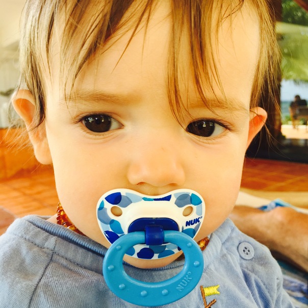 The cute, redish-blondish baby is sucking on a blue NUK pacifier