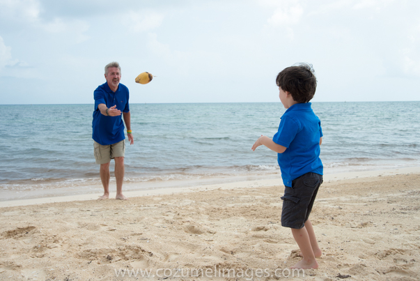 There is a man in a blue shirt tossing a yellow object to a child in a blue shirt.