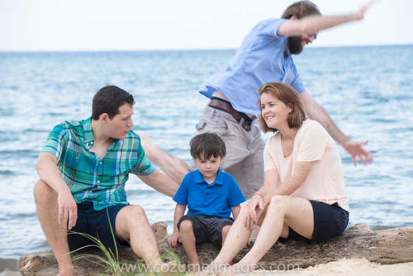 Beautiful family enjoying a fun day at the beach while silly guy behind them photo bombs their picture.
