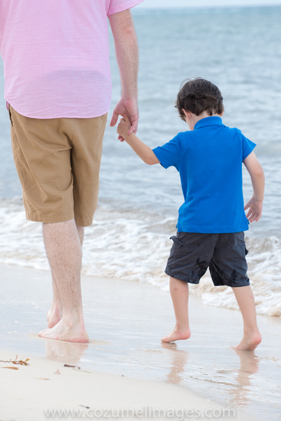 A very clear photo of a father walking his son by hand on a beach.