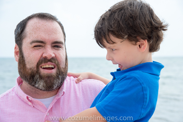 a man with a slightly grey beard smiles while holding a young boy in a blue shirt.