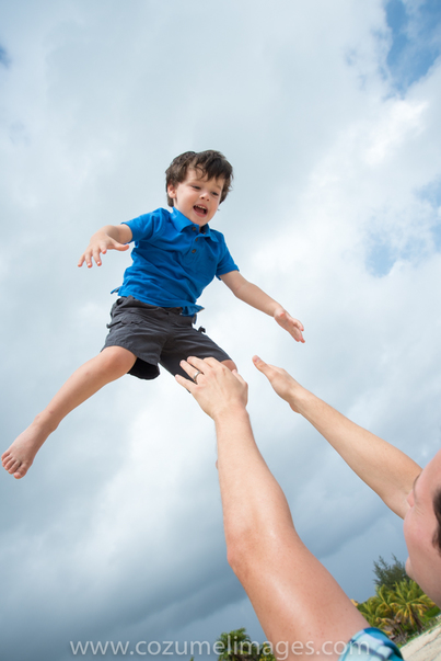 The child is laughing because he is being tossed in the air and then caught by his dad.
