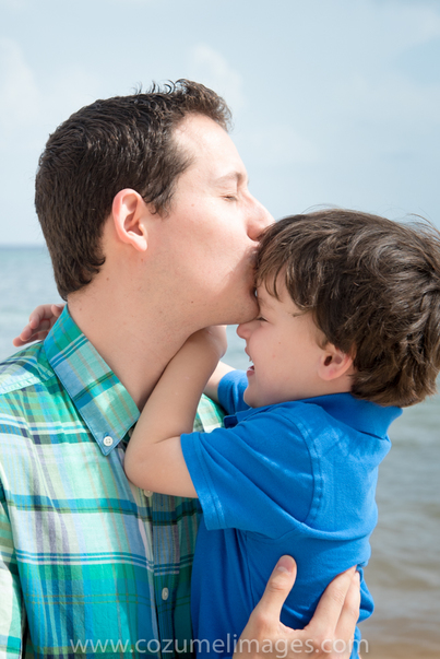The little boy is cradeled in his father's arms while being kissed on the forehead.