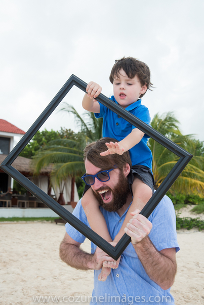 A man screams through an empty picture frame as the child on his shoulders reaches through.