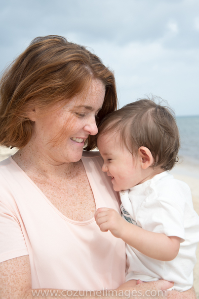 A smiling women with red hair and a light pink shirt is holding a smiling baby in her arms.