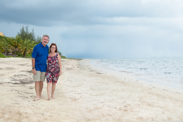 An older man in a blue shirt and a smiling woman with glasses and a multicolored dress pose on a beach.