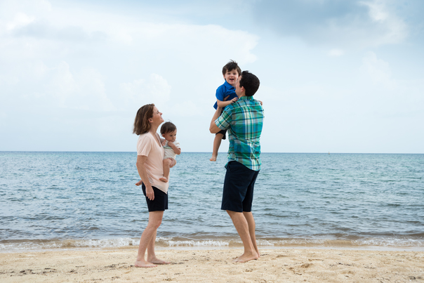 Mother and father with two children having fun on a sandy beach next to the ocean.