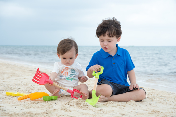 The cute little boy in the blue polo shirt is sitting next to his baby brother on the warm sandy beach near the blue water, and explaining how to use the colorful plastic beach toys.