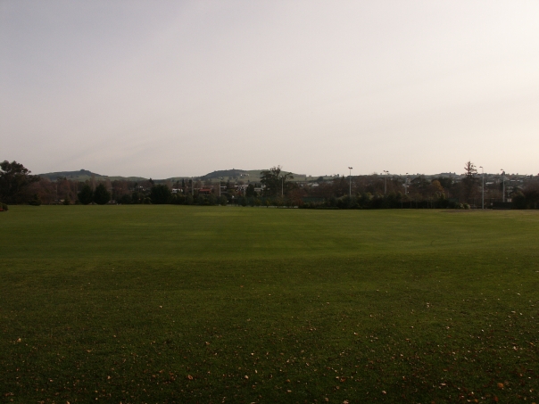 A grassy field with a line of trees in front of a hill in the distance.