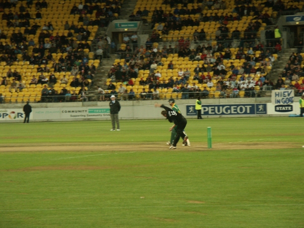 As it happens, there was a bit of rain in the earlier part of the day and so the game was delayed and then ultimately shortened. I can't recall specifically how many overs it was shortened, but it turned out to be a very exciting game with New Zealand clinching the win by just a few balls in the very last over.