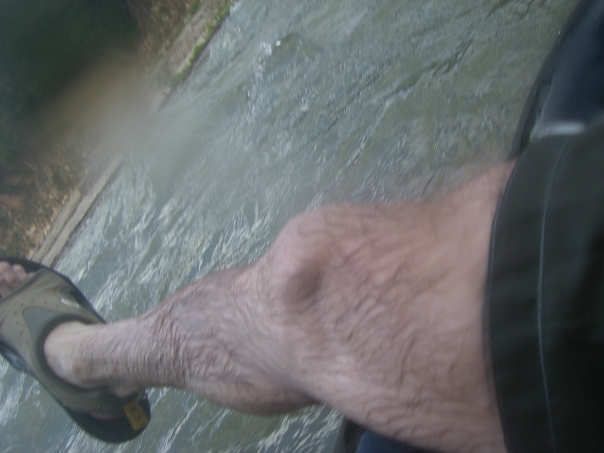 A picture of a leg that has a river in the background.