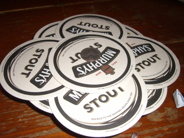 A pile of cardboard, circular coasters that reads "Murphy's Stout" is on the bar.