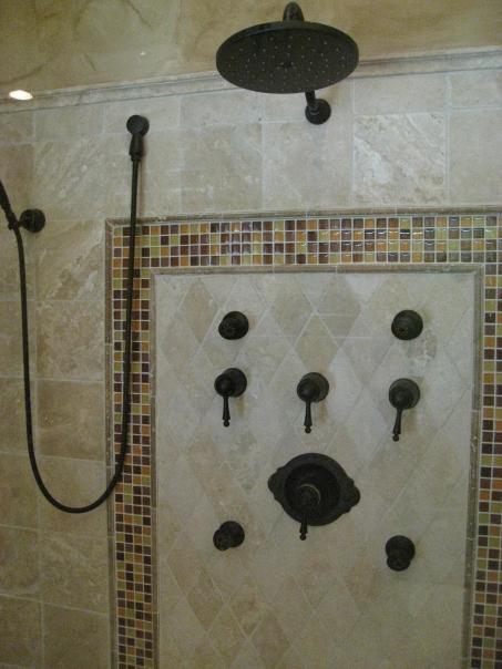 This is a complex shower system with multiple valves and handles, all black in color.