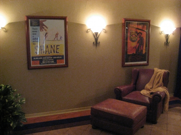 This is in a movie room in someone's house with a leather chair, a throw and a footstool with 3 sconces on the wall.