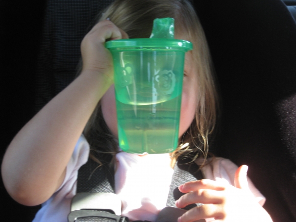 This small and silly little toddler in her strapped car seat, is smiling through her green sippy cup which makes her little teeth appear to be extremely large.