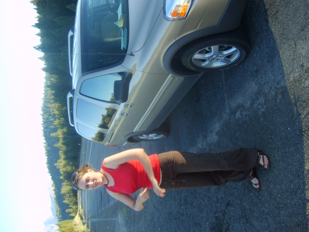 Shows a girl, a minivan, and a road with trees and hills in the back ground.