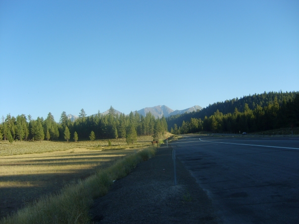 An empty roadway passes between evergreen trees and towards mountain peaks.