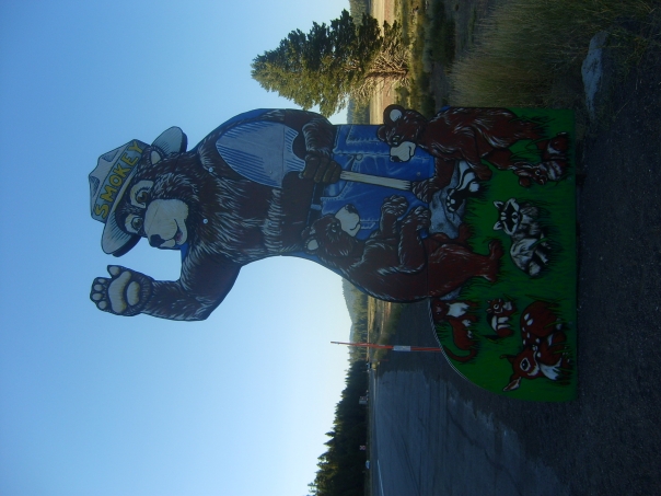 A wooden Smokey the Bear cutout waving with bear cubs at his feet with a forest in the background.