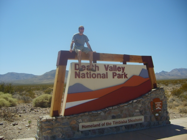 man sitting on top of sign at entrance to Death Valley National Park