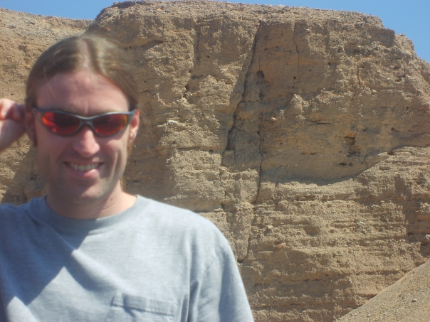Man in sunglasses and a blue t-shirt standing in front of a rock-face in a desert.