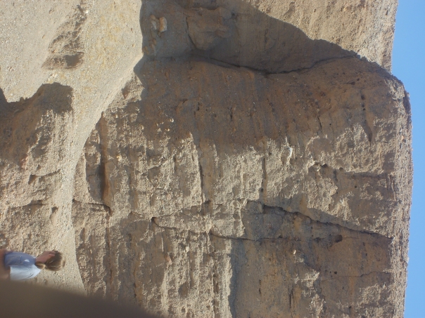 A rock face in a desert is shown a man in a blue t-shirt is also in the picture.