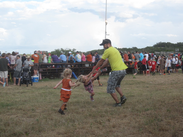 While at an event, a dad playing with his two daughters outside.
