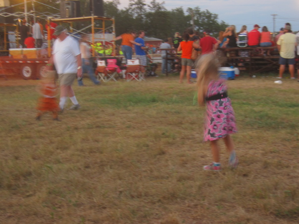 A group of people at a concert setting with what appears to be multiple stage areas, and the image is focused on a little girl in a pink dress who may be dancing, while a man and another girl in a red dress pass nearby.