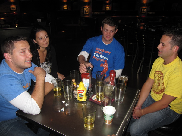 Three mens are enjoying the hot drinks at bar with his girl friend |