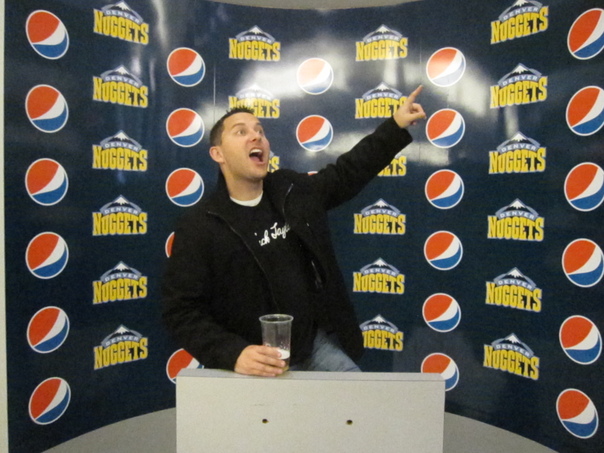 A man is sitting with a plastic glass of beer in one hand while enthusiastically pointing upwards with the other while sitting in front of a screen covered with Pepsi and Denver Nuggets logos.