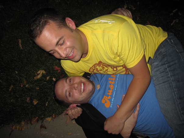 it is a photo of two men are hugging and laying on the floor |