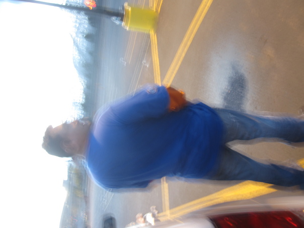 A man wearing a blue shirt and blue pants is standing in a parking lot. |