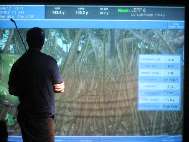 a man is wearing blue t-shirt and brown pants is holding golf club in his hands. |