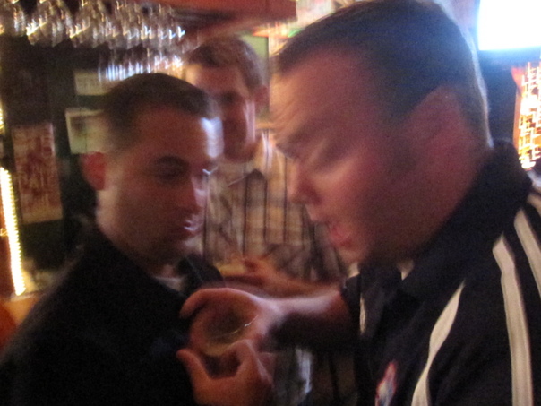 Three men are standing in a room that has clear glasses hanging from the ceiling. |