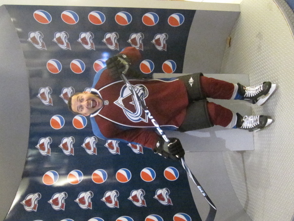 A happy ice hockey player in a red tracksuit and laced up skates is grinning widely. |