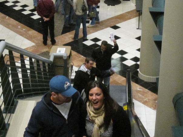 The image shows four people in dark colored jackets riding up an escalator. |
