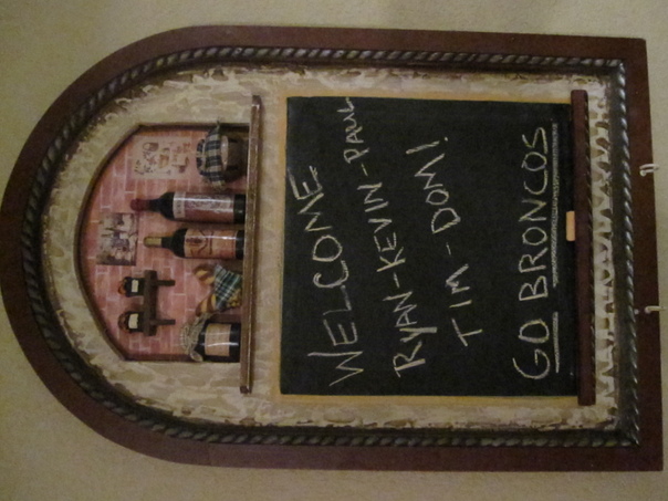 A decorative chalk board with a brown frame is hung on a tan wall. |