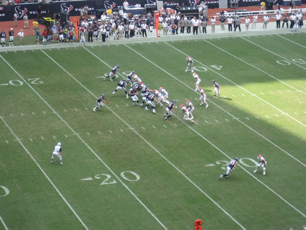 Two opposing teams of men in blue and white jerseys are playing a game of football on a green field. |