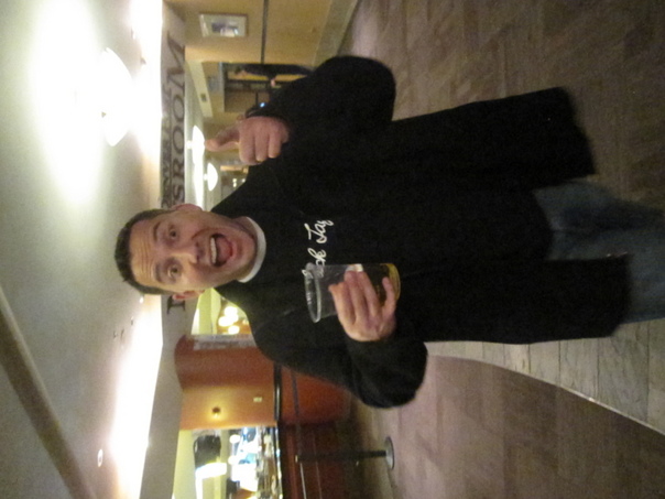 A man makes an excited face and points at the camera as he holds a drink in one hand. |