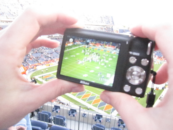 A person is taking a picture of a field of foot ball players with a digital camera. |