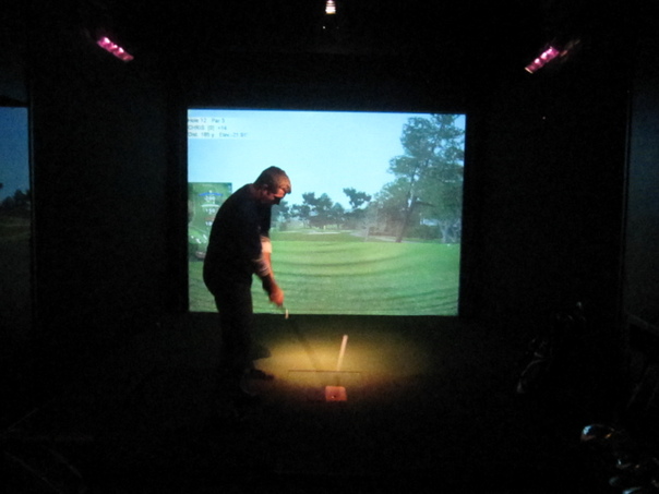 A male golfer showing determined concentration hits a ball down a bright green fairway. |