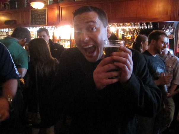 A man in a black shirt is holding a clear glass full of liquid in a room with many people. |