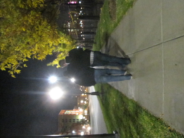 At night time two persons walking on footpath with full of lighting. |