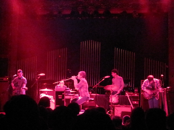 A concert under red lights on stage and a large crowd. |