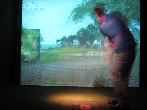 A blurred picture shows a man playing a simulated golf game in muted light. |