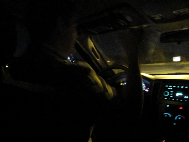 The man is driving his car on the road in the dark. |