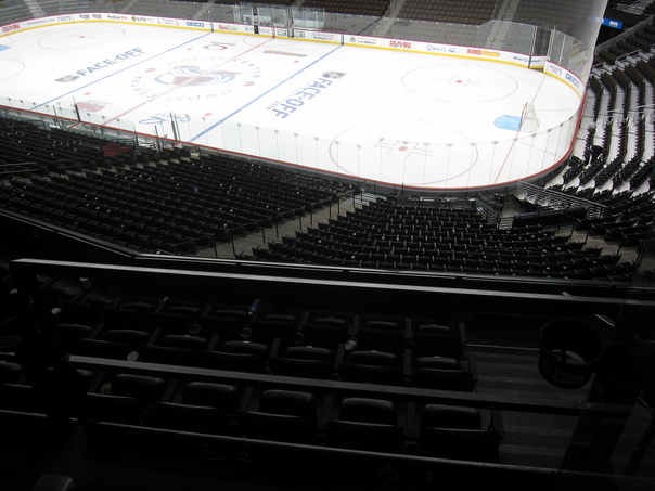A view from the stands of an empty hockey rink |