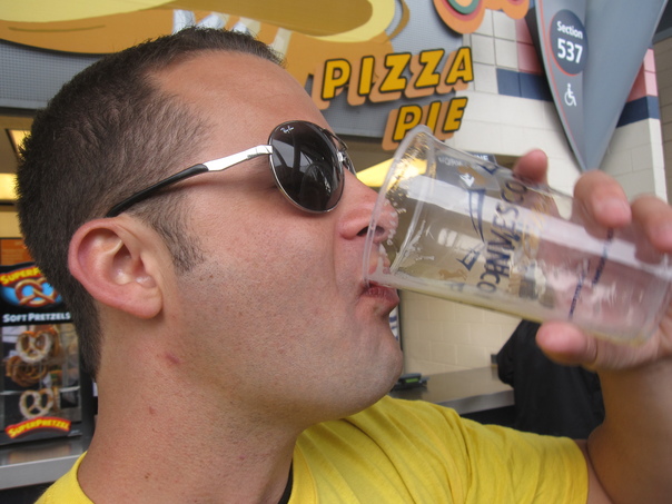 A man in a yellow shirt is drinking from a clear plastic cup. |