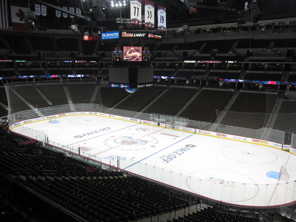 The white ice of an empty hockey arena stands in contract to the large dark, empty area that surrounds it. |